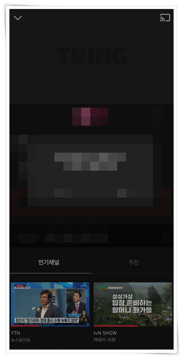 2. 티빙 앱 설치 후 상단 메뉴에서 "실시간"을 클릭해 주세요.